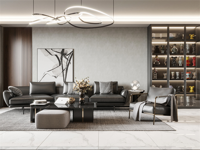延续灰棕大地色系,不规则线条软装打破刻板。沙发背景墙用几何造型挂画点睛,暖光射灯聚焦艺术感。展示柜藏童心手办,让个性表达融入日常,尽显后现代的随性与张力。