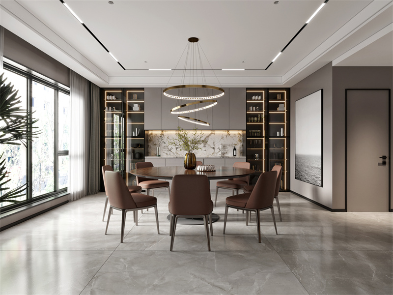 延续灰色基调,圆形餐桌适配大家庭围坐,弱化棱角更显温馨。灯光聚焦桌面,强化用餐仪式感。餐椅与整体风格呼应,既满足多人聚餐需求,又以现代设计语言传递团圆氛围。