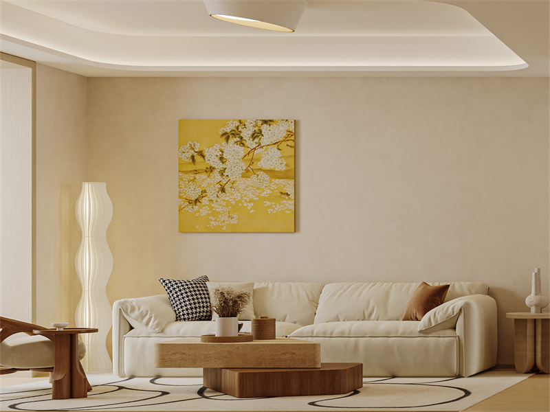 客厅空间设计简约大方,开放式布局让活动更自如。浅米色墙面搭配白色沙发,营造出温馨舒适的居家氛围。黄色挂画为空间添亮点,绿植与抱枕增添生活气息,强调功能性与自然质感。