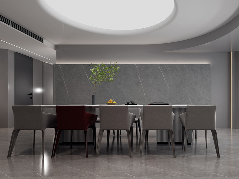 延续整体灰色系,圆形顶灯与石材背景呼应,构建沉稳仪式感。餐椅以深红跳色打破单调,适配家庭聚餐、朋友小酌。桌面绿植、鲜果添生活气息,让用餐场景在简约中藏温情,诠释现代风格的精致烟火。