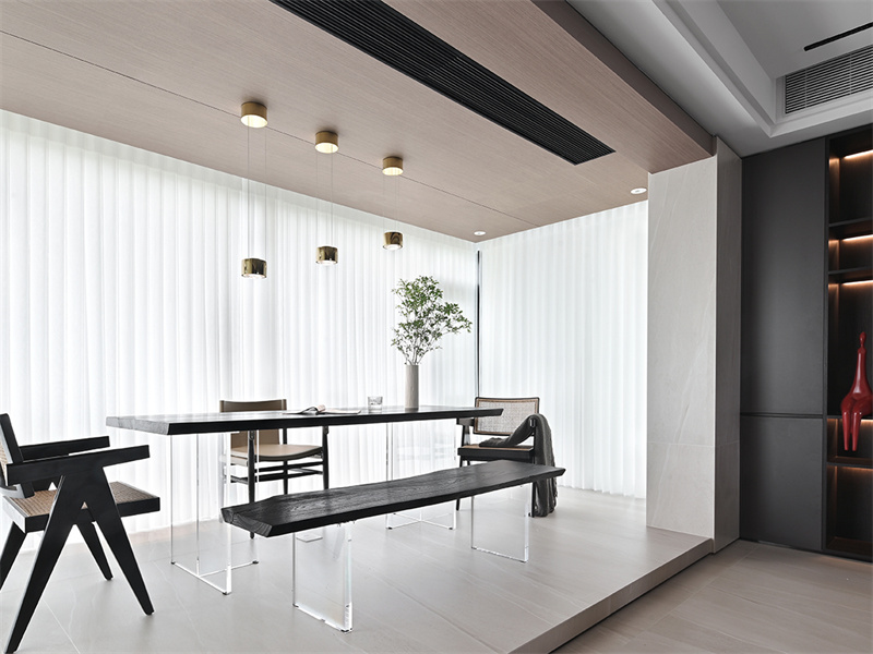浅木吊顶配黄铜小灯,黑檀餐桌搭透明椅,弱化空间边界。白帘滤进柔光,晨起用餐、午后品茶,绿植舒展生机。极简布局让烹饪香与自然风交融,材质碰撞间,把进餐变成惬意仪式。