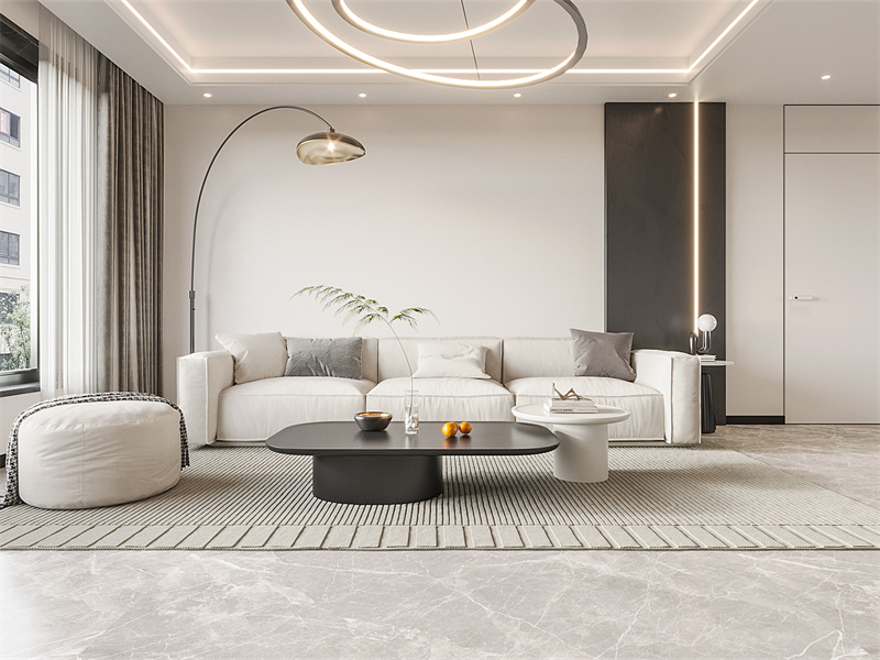 以白、黑为主色调,搭配浅灰地毯,简洁大气。环形吊灯与个性电视墙设计,增添现代感,适配休闲观影、会客,在简约中营造出舒适开阔的居家氛围,尽显现代生活的雅致与实用。