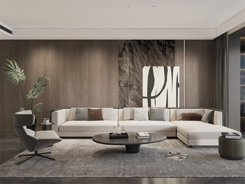 本案采用意式极简风格,以深棕、灰、米白等中性色调为基底,通过简洁利落的线条与大理石、木质等质感材质融合,营造出雅致时尚的空间氛围。