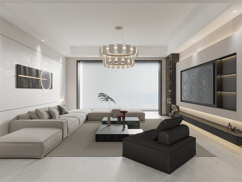 以黑白灰为基底并融入木质温暖质感,悬浮式电视墙与通透玻璃收纳柜简洁大气,艺术感叶片吊灯成为视觉焦点,单人休闲榻与低矮茶几的搭配,既适合全家围坐观影,也能承载好友轻松小聚,展现出现代简约的大气与舒适。
