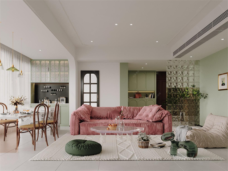 本案为现代风格,以白、浅绿、粉色等柔和色调为基底,融合玻璃砖、复古家具等多元元素,整体营造出兼具活力与舒适的现代居住氛围。