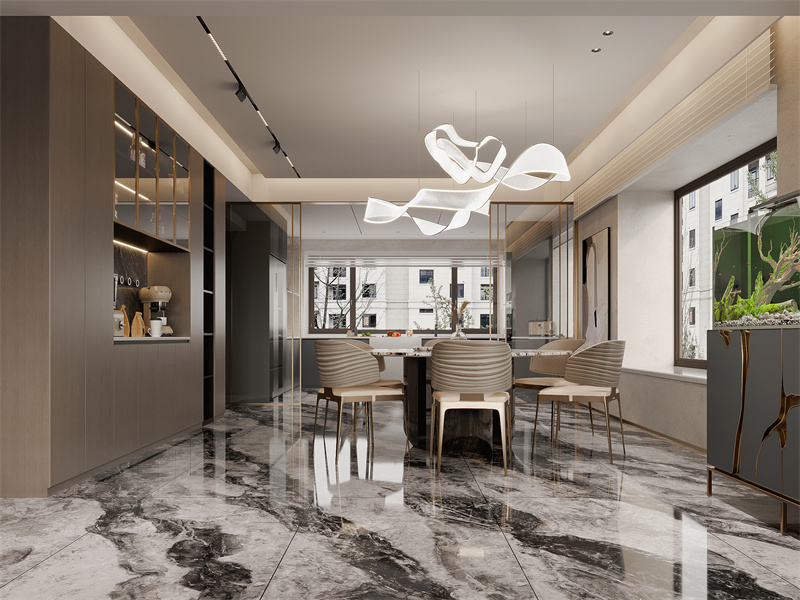 深棕与浅米交织,艺术造型吊灯点亮空间,大理石地面提升质感,收纳柜与用餐区一体设计。家庭聚餐时,精致软装与实用布局结合,传递出兼具仪式感与便利性的轻奢饮食氛围。